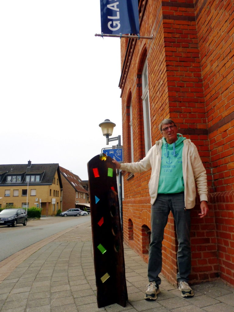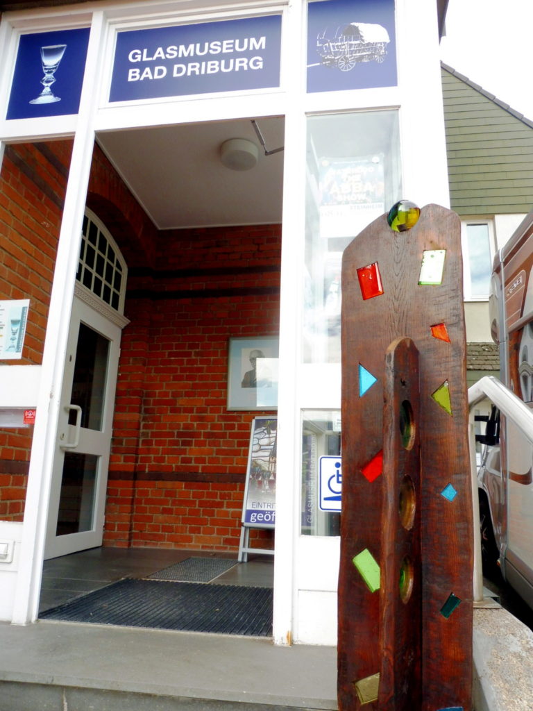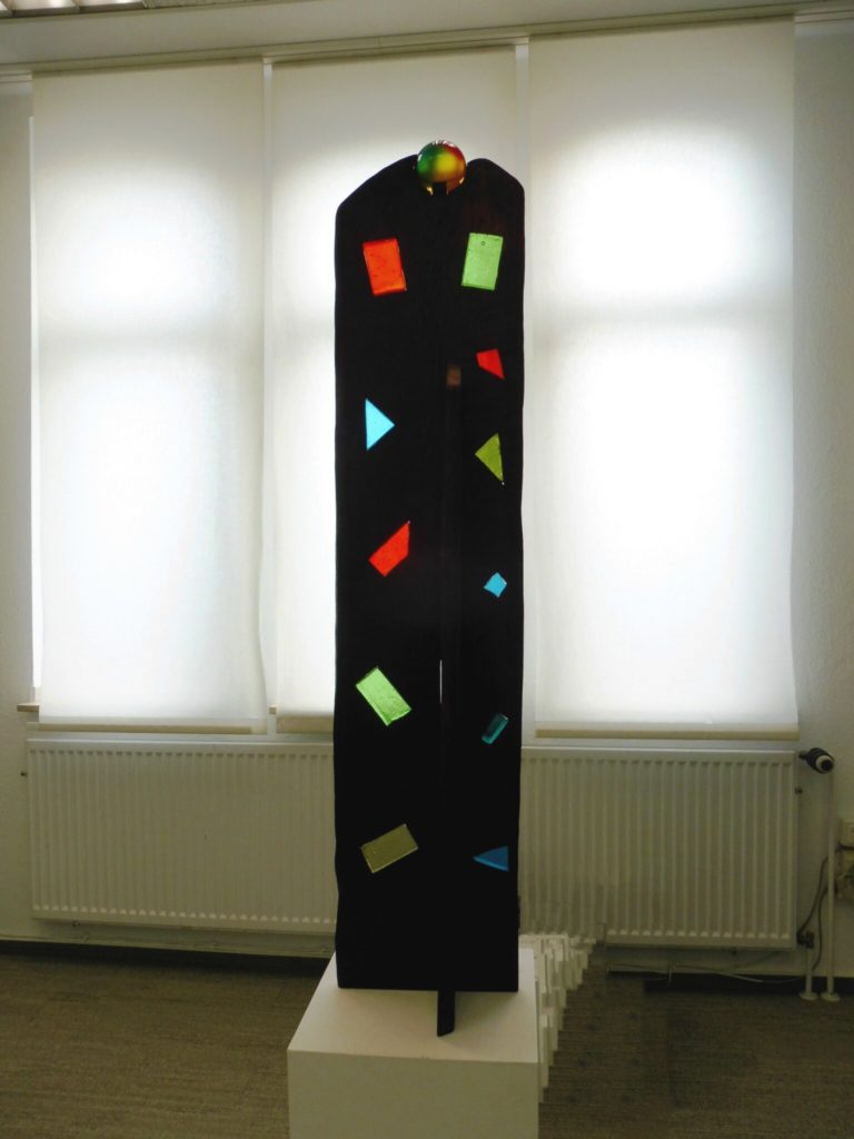Die Stele aus Holz mit Glasverzierungen ist nun Teil der Kunstausstellung von Dietmar Reil im Glasmuseum Bad Driburg.