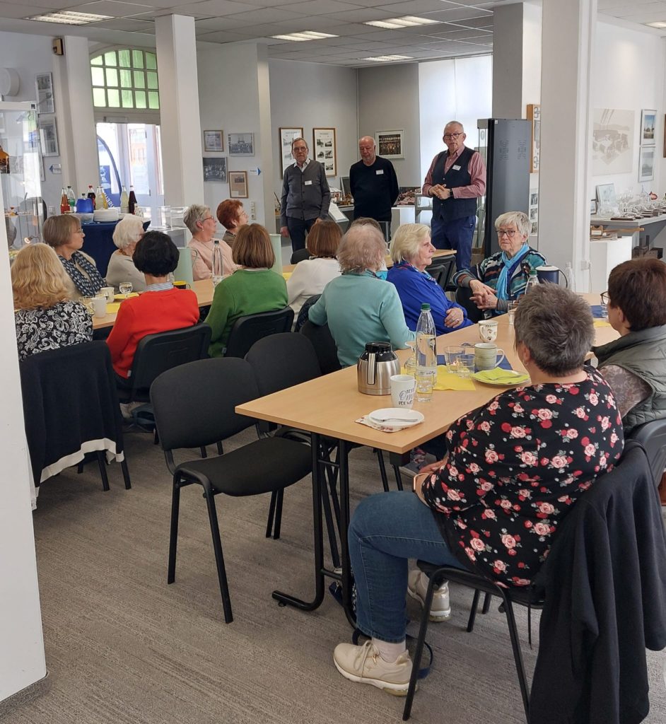 Das ehrenamtliche Museumsteam hatte die Eingangshalle mit den neuen mobilen Tischen und Sesseln sowie dekorativen Gläsern ansprechend vorbereitet. Der Bürotresen verwandelte sich in ein einladendes Kuchenbuffet. Michaela Menne‑Nolten hatte eine beeindruckende Auswahl selbst gebackener Kuchen sowie Kaffee und Tee mitgebracht – beste Voraussetzungen für einen genussvollen Nachmittag.