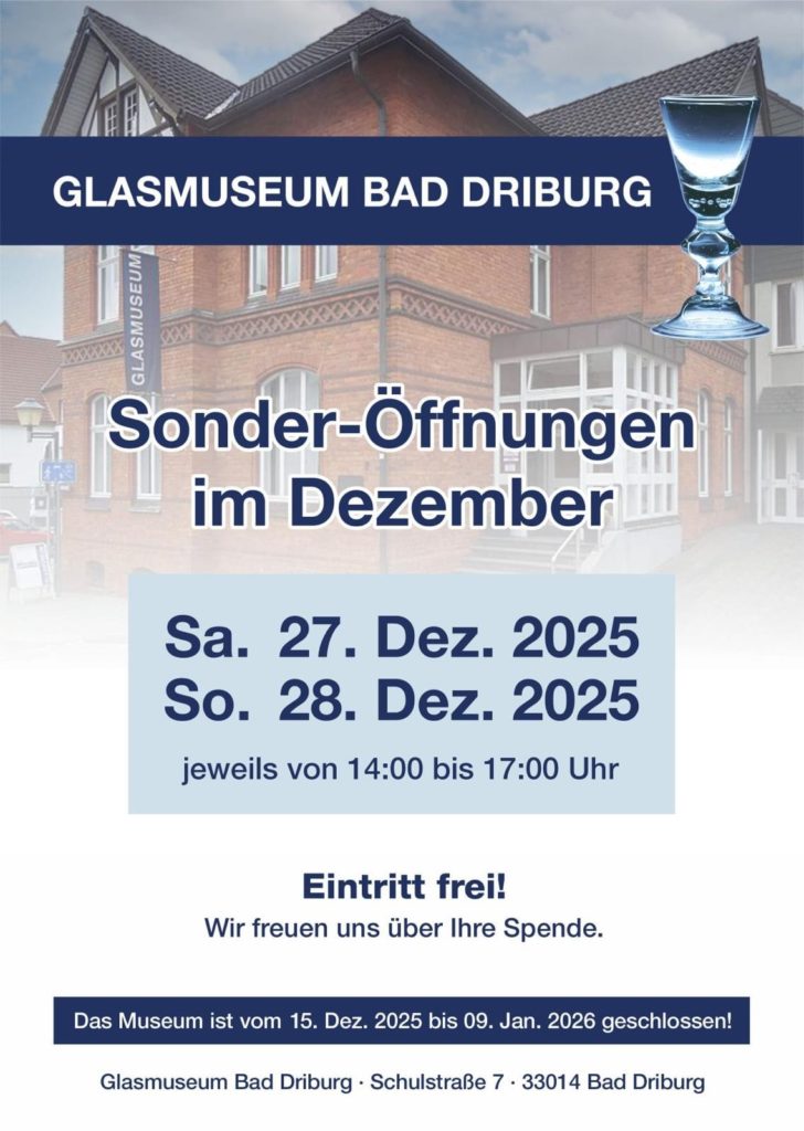 Das Glasmuseum Bad Driburg bleibt vom 15. Dezember 2025 bis zum 9. Januar 2026 geschlossen.